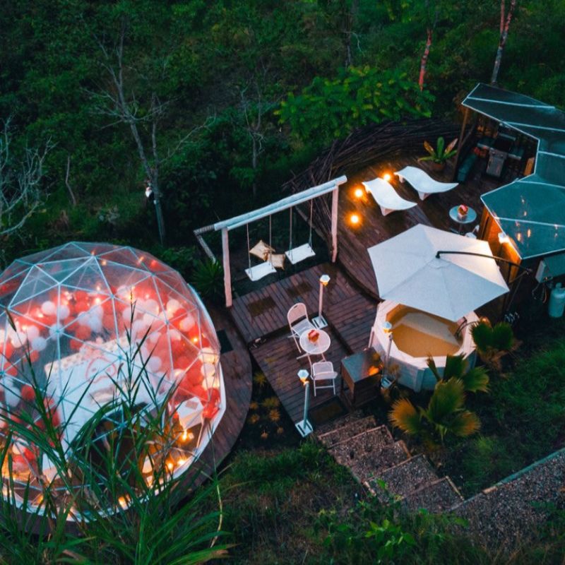 Vive una experiencia única en medio de la naturaleza sin renunciar a la comodidad. Este glamping está diseñado para quienes buscan aventura y descanso al mismo tiempo: una carpa tipo domo con cama doble, baño privado y una terraza con vista privilegiada al cielo nocturno.